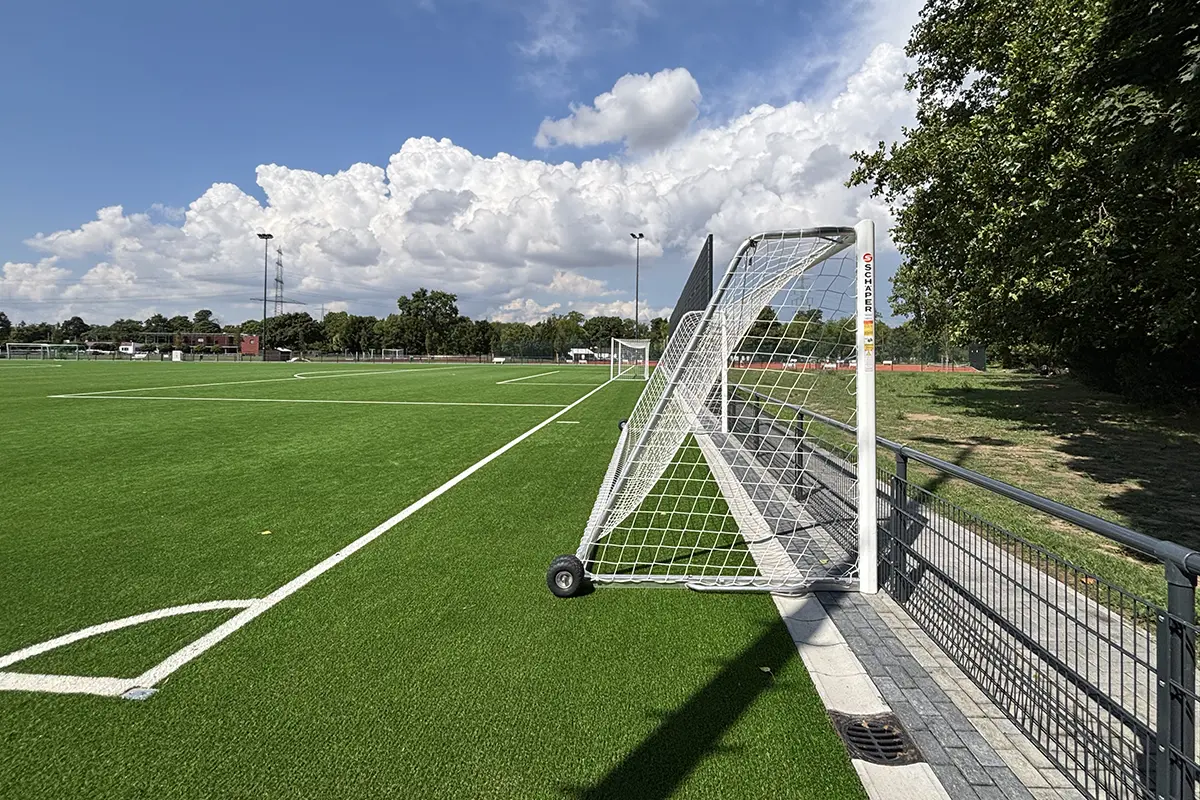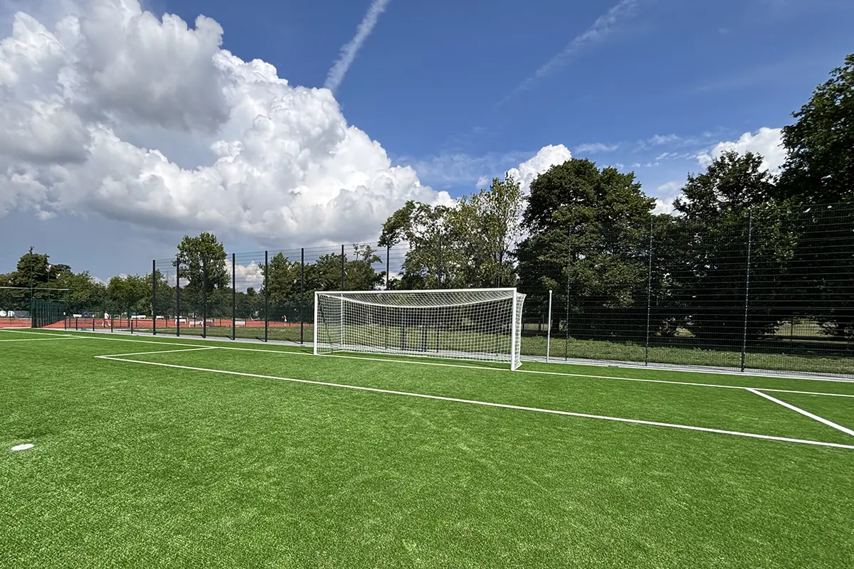 Das Kopfballpendel wurde speziell für einen bereits bestehenden Stabgitterzaun entworfen, konstruiert und von uns produziert. Die Lösung ist praxisnah und flexibel – das Pendel kann ganz einfach zur Seite geschwenkt werden und steht beim nächsten Training im Handumdrehen wieder bereit.